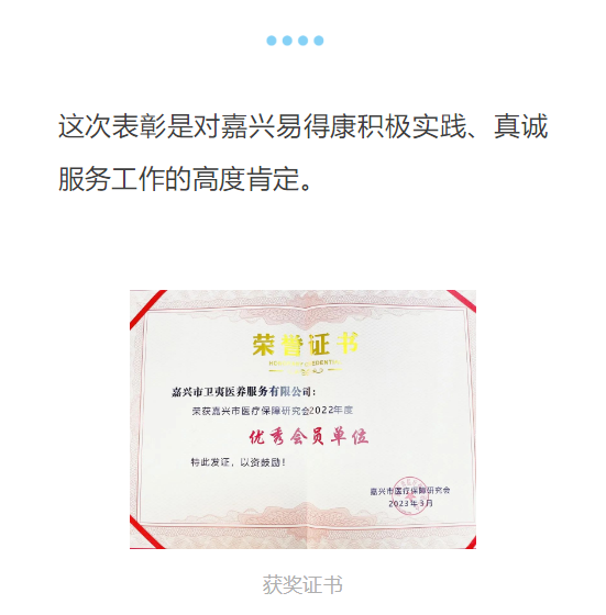 喜訊丨嘉興易得康當選市醫(yī)療保障研究會“2022年度優(yōu)秀會員單位”!